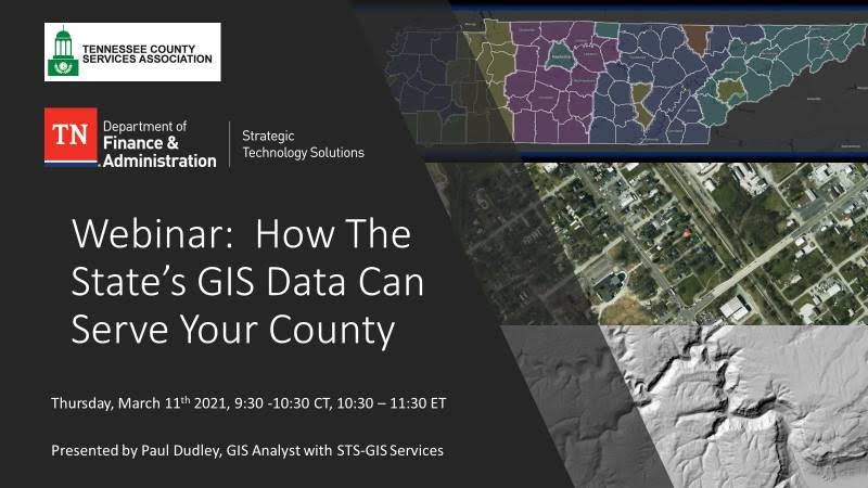 The State of Tennessee will be hosting a webinar on March 11, 2021 at 10:30 am on how to leverage the State's growing set of GIS data and services. The webinar, entitled "How the State's GIS Data Can Serve Your County", is promoted by the Tennessee County Services Association and will be presented by Mr. Paul Dudley, and the Dept. of Finance's Strategic Technology Solutions (STS) office.
