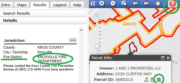 Also, the Parcel Identify...Get Parcel Details tool in KGIS Maps has been updated to now display each parcel's associated Fire District. One can see the new value in the Jurisdiction section of Results pane (see below image).